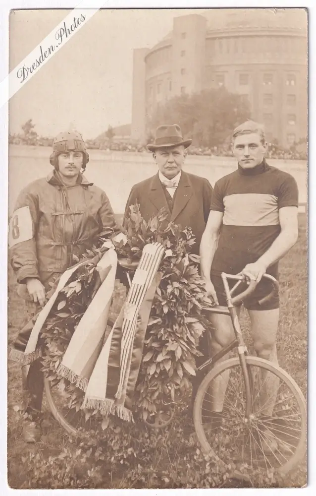 Radrennbahn auf der Liebstädter Straße in Dresden-Reick, im Hintergrund Gasometer von Hans Erlwein