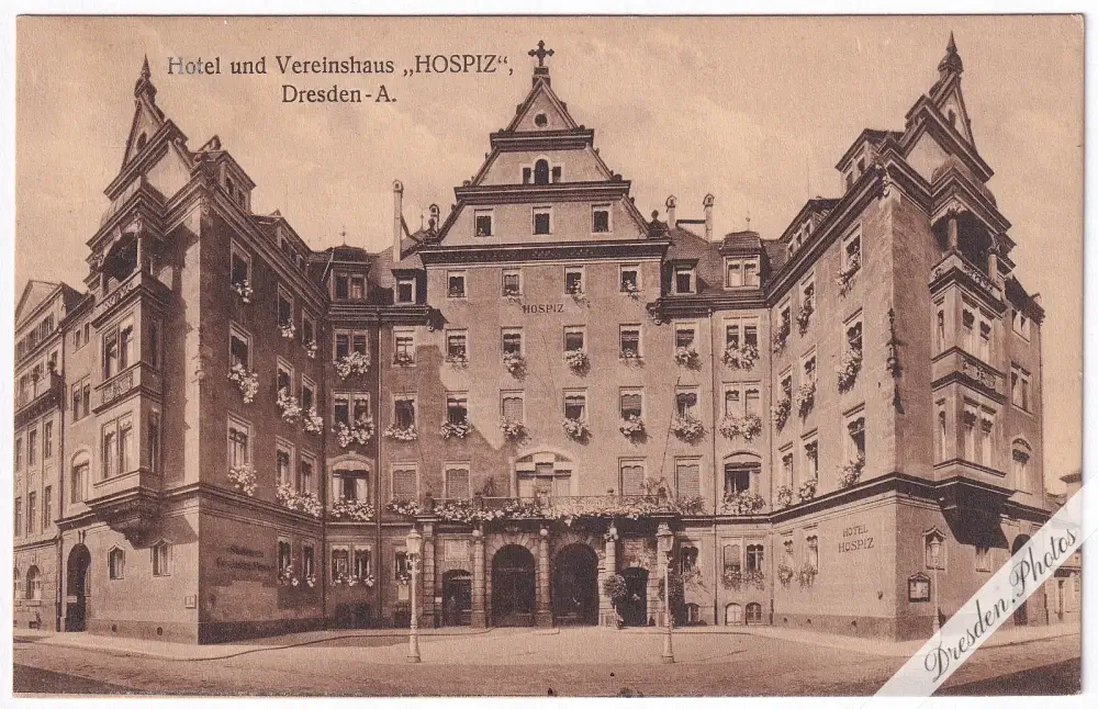Hotel und Vereinshaus „Hospiz“, links Höhere Töchterschule auf der Zinzendorfstraße