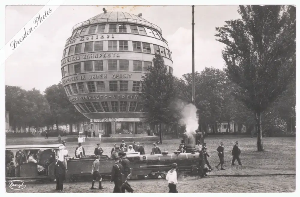 Liliputbahn vor dem Kugelhaus im Ausstellungsgelände