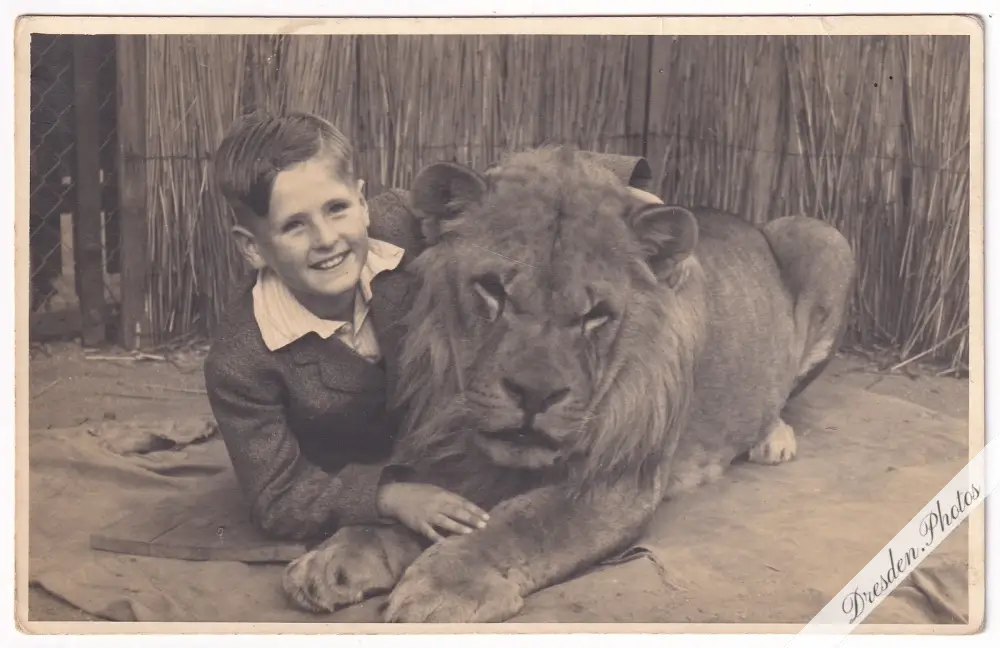 Junge mit Löwen, ev. im Zoologischen Garten