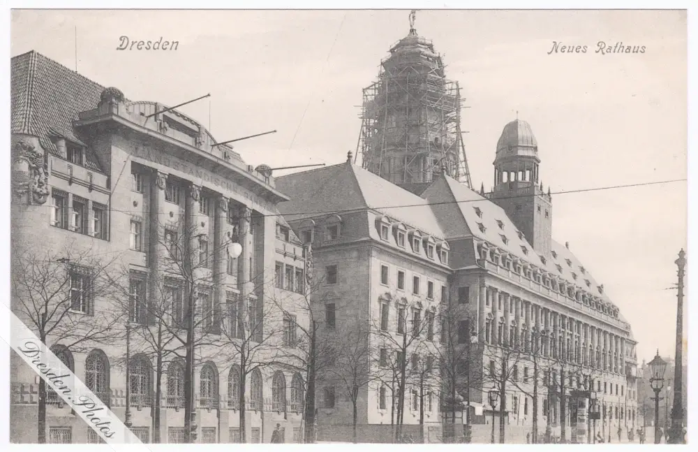 Neues Rathaus im Bau, davor Landständische Bank an der Pfarrgasse