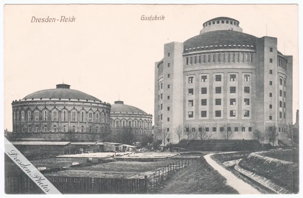 Gasfabrik Dresden-Reick, auf der rechten Seite der neue Gasbehälter III von Erlwein